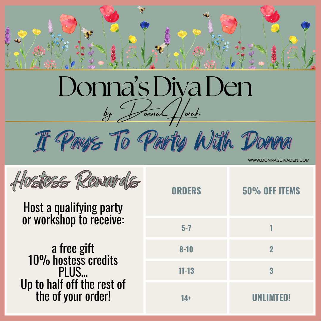 Host a party or workshop with Donna’s Diva Den and enjoy exclusive perks! Get a FREE gift, 10% cash back in hostess credits based on your event’s sales, and up to unlimited half-off items to stock up on your favorites. Fun, friends, and fabulous rewards—let’s plan your event today!