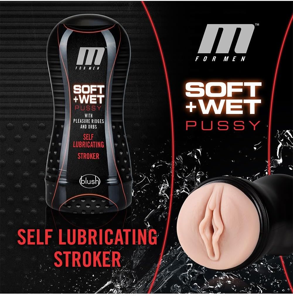 Experience ultimate pleasure with the M for Men Soft & Wet Pussy stroker. This self-lubricating, pocket-sized masturbator features sensational textures with pleasure ridges and orbs that massage your shaft with every stroke. Add water or saliva for slippery fun, then control suction with the PerfectFlo™ air valve and pliable cup, mimicking the feel of a blow job. Open-ended and generously sized at 7.25" x 3.25", it fits all sizes and can be used with or without the canister. Self-lubrication lasts up to 12 uses and is refreshable with water-based, silicone, or hybrid lube and toy powder for extended enjoyment.
