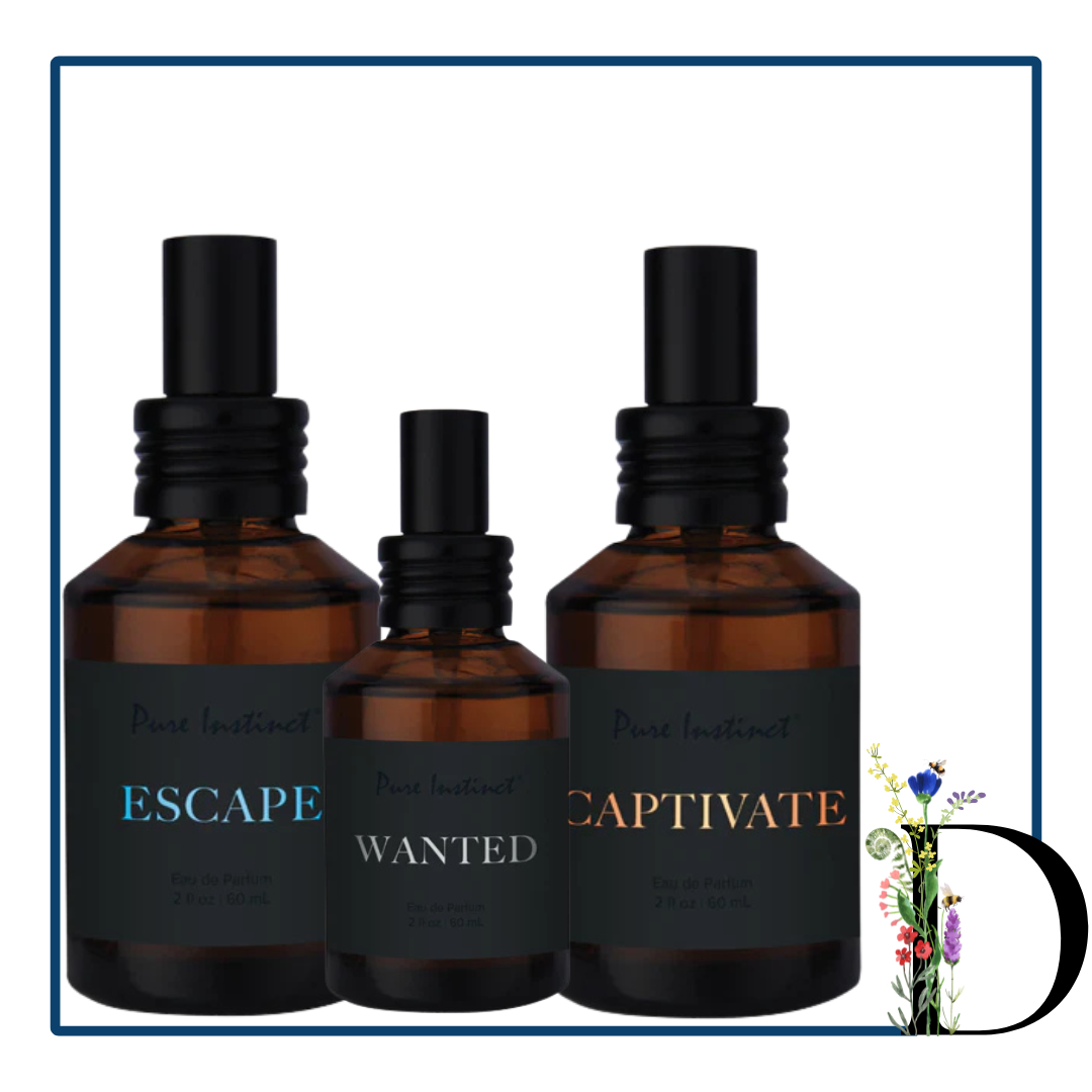 Awaken your senses and unleash your allure with our captivating fragrance trio—Wanted, Escape, and Captivate. Each scent is crafted to blend uniquely with your body’s chemistry, creating a one-of-a-kind aroma that may enhance your natural pheromones and elevate your sex appeal.