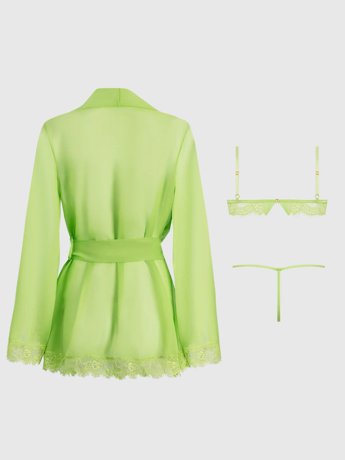 Includes a robe, bralette, and thong in sheer chiffon and lace.