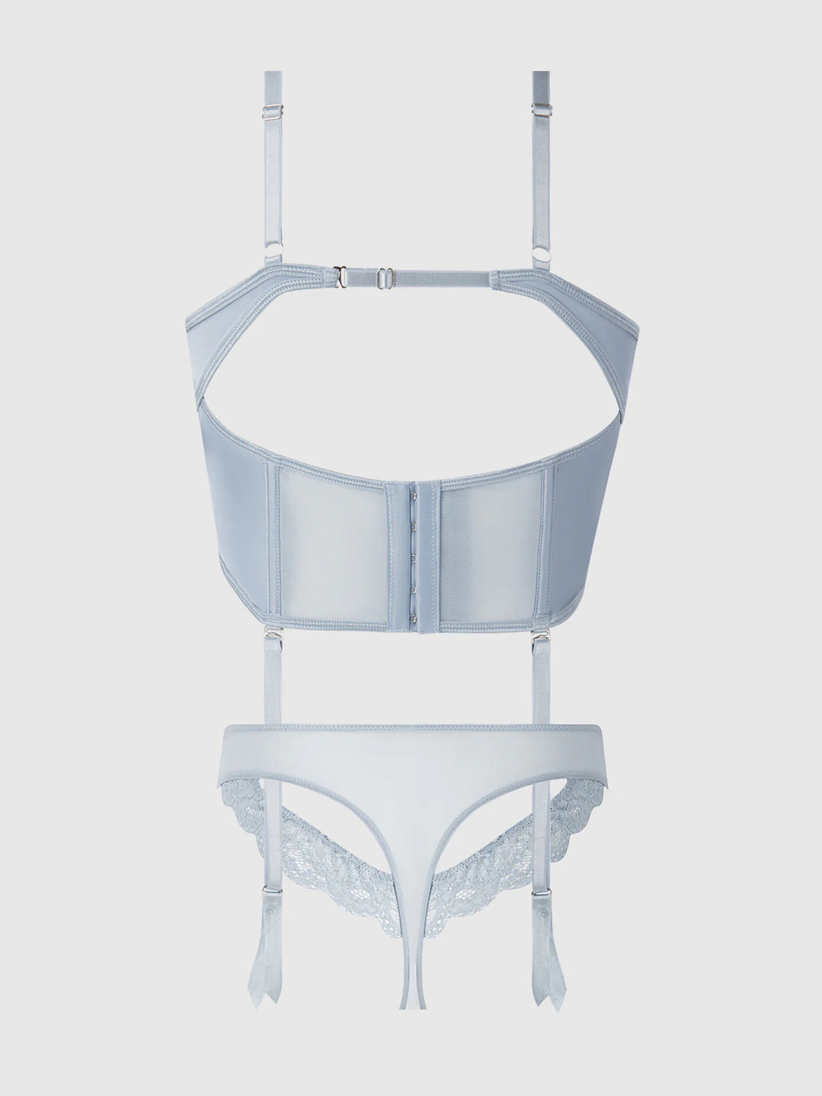 Slide into the angelic allure of the Sienna Bustier Set, crafted in whisper-soft satin and mesh with delicate lace accents. Features a daring deep square neckline and unlined wired bra cups. The meticulously placed boning cinches the waist, enhancing your natural silhouette, while adjustable straps and detachable garters offer versatility. The enchanting satin and mesh cutout panty details promise a breath of romance.