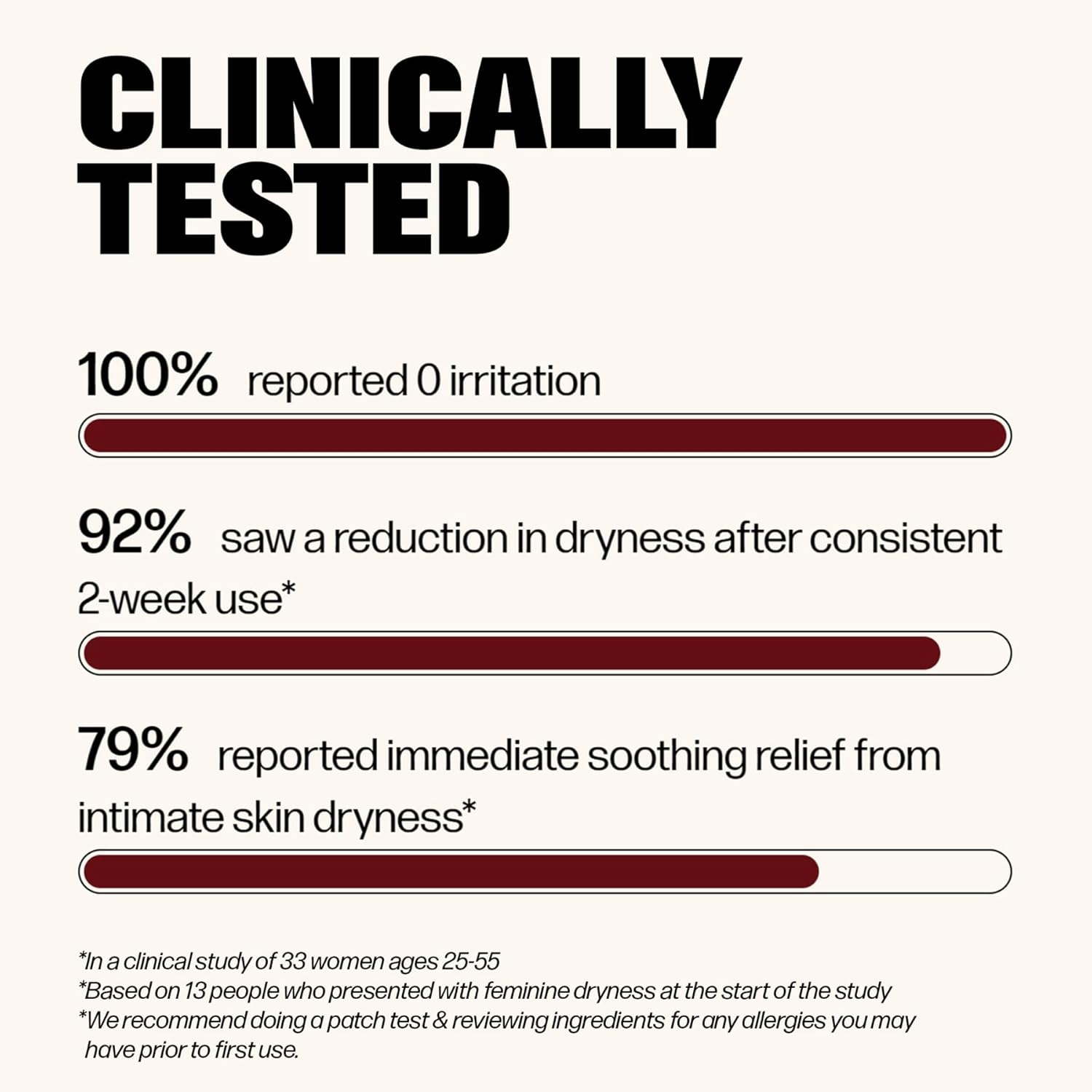 - Clinically Proven: In a clinical study of 33 women ages 25-55, 100% reported zero irritation & 79% reported immediate soothing relief from intimate skin dryness