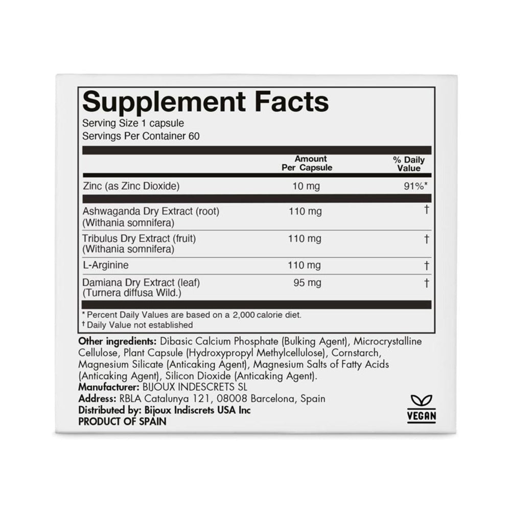 Ingredients: Bulking Agents (Calcium Phosphates), Corn Starch( Corn Starch, Anti-caking Agents [ Cellulose, Magnesium Silicate, Magnesium Salts of Fatty Acids and Silicon Dioxide ] ), Composition of plant capsule coating (Hydroxypropyl Methylcellulose), Ashwagandha Dry Extract (Withania somnifera, root), Tribulus Dry Extract (Tribulus terrestris, fruit), L-Arginine, Damiana Dry Extract (Turnera diffusa Willd., leaf), Zinc Oxide.