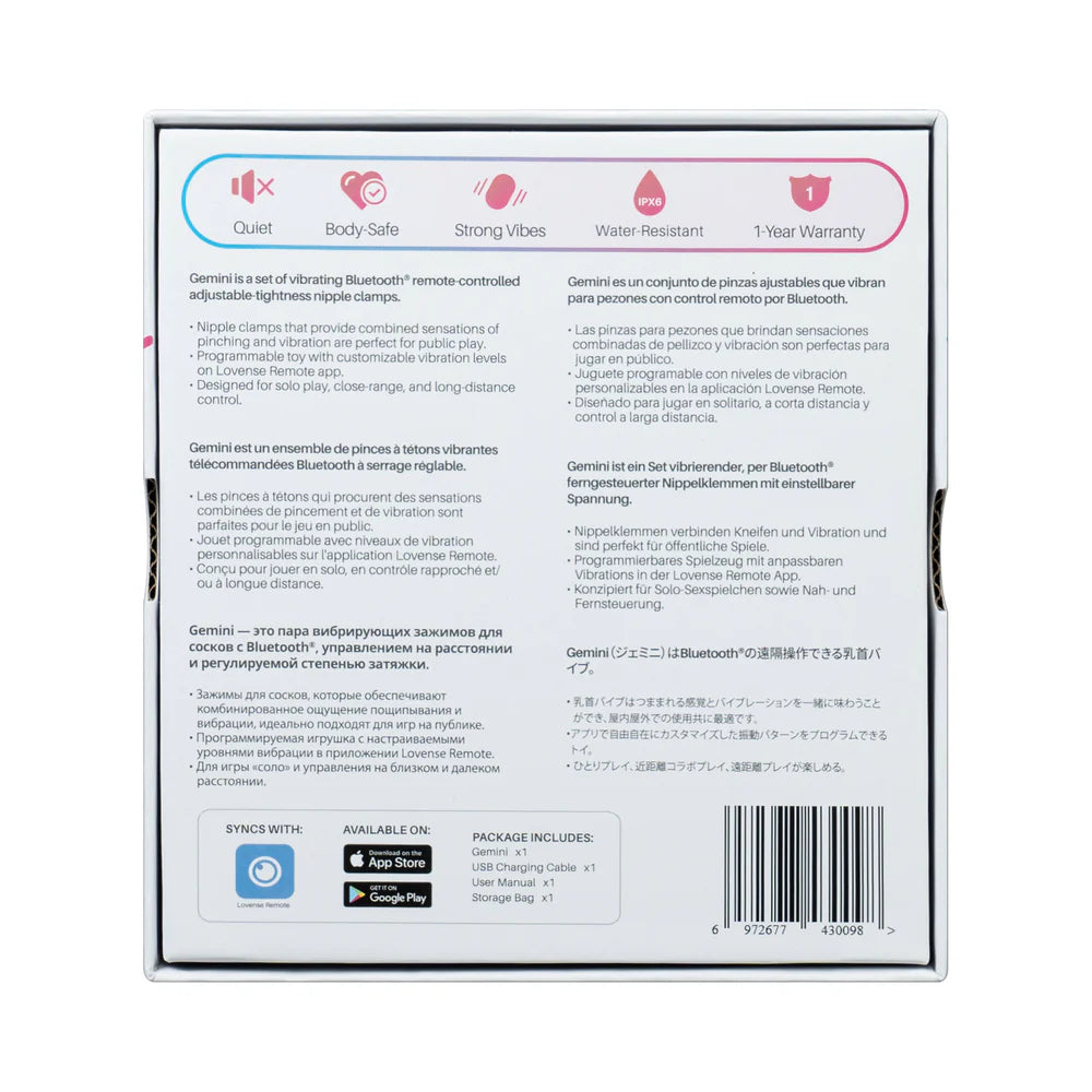 Meet Gemini - the worldft.s first app-controlled adjustable vibrating nipple clamps. Wear Gemini however you want. Carry them discreetly and go out for new adventures. From foreplay, roleplay, to light BDSM, you can incorporate our nipple clamps into your routine with Lovense Remote app! Enjoy the perfect combination of clamps and vibrations.