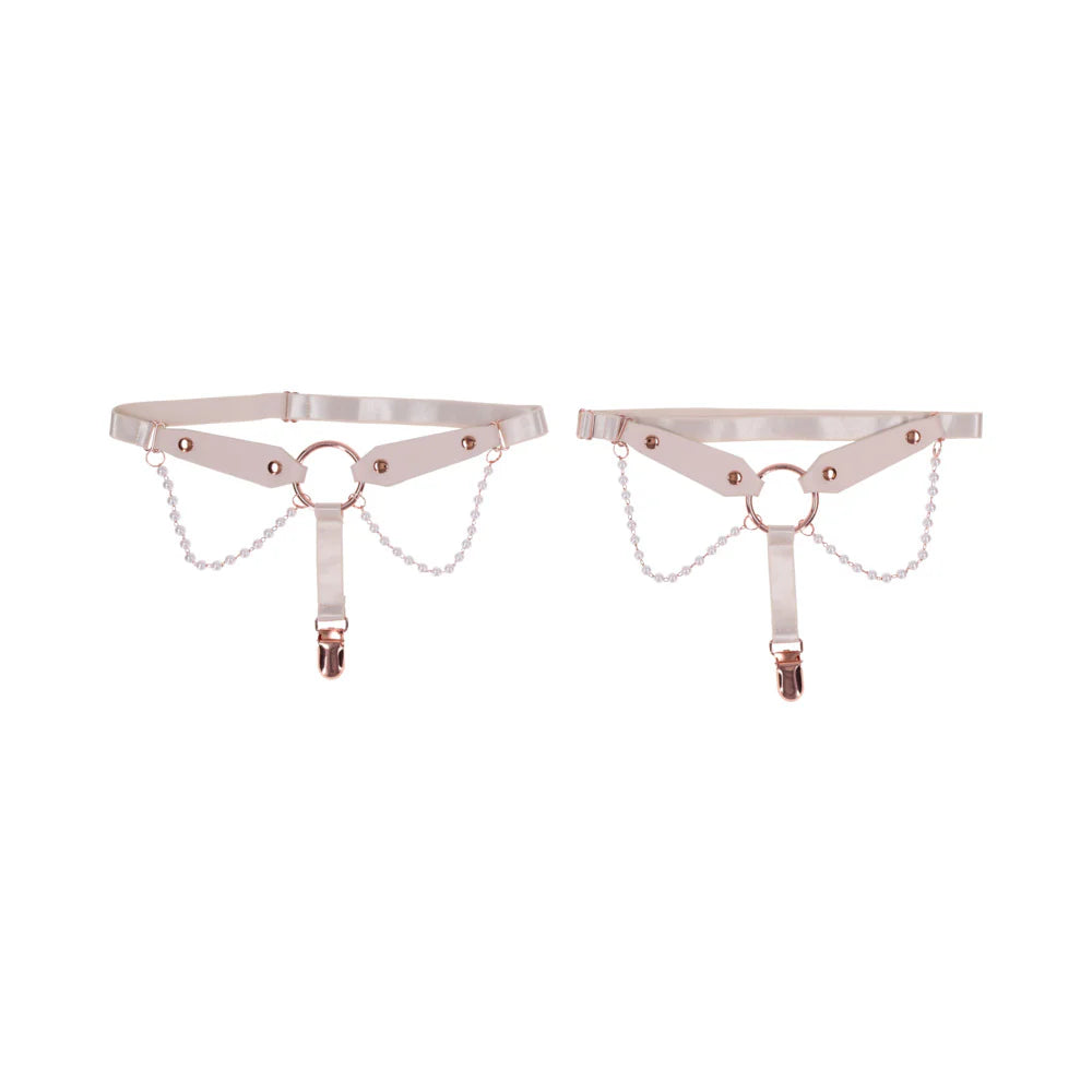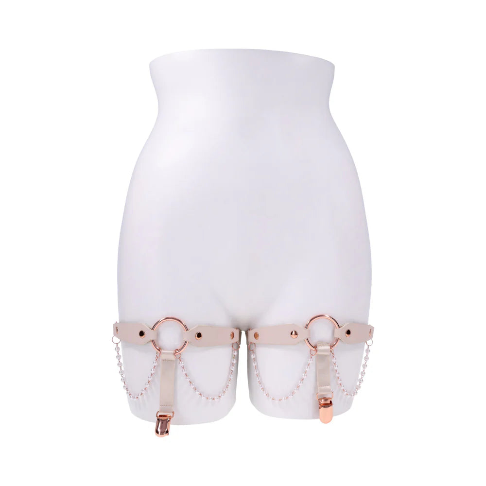 These luscious Peaches 'N CreaMe Garters are made to turn heads and raise pulses. Crafted from soft faux leather and adorned with delicate pearl strands, a gleaming rose gold O Ring, and functional garter clips, they blend elegance with irresistible edge. Fully adjustable for a perfect fit, they wrap your thighs like a sensual secret, tempting anyone within view to take a closer look or a daring bite. The secure clips hold your thigh highs in place, letting you strut with confidence and command attention at every step. Seduce with style, tease with power, once they catch a glimpse, they'll follow your lead without question.