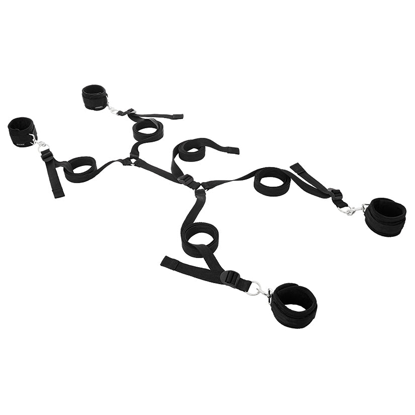 - 4 adjustable cuffs (fits 4-12" wrists), four restraint straps secured to one connector strap that fits securely under your mattress